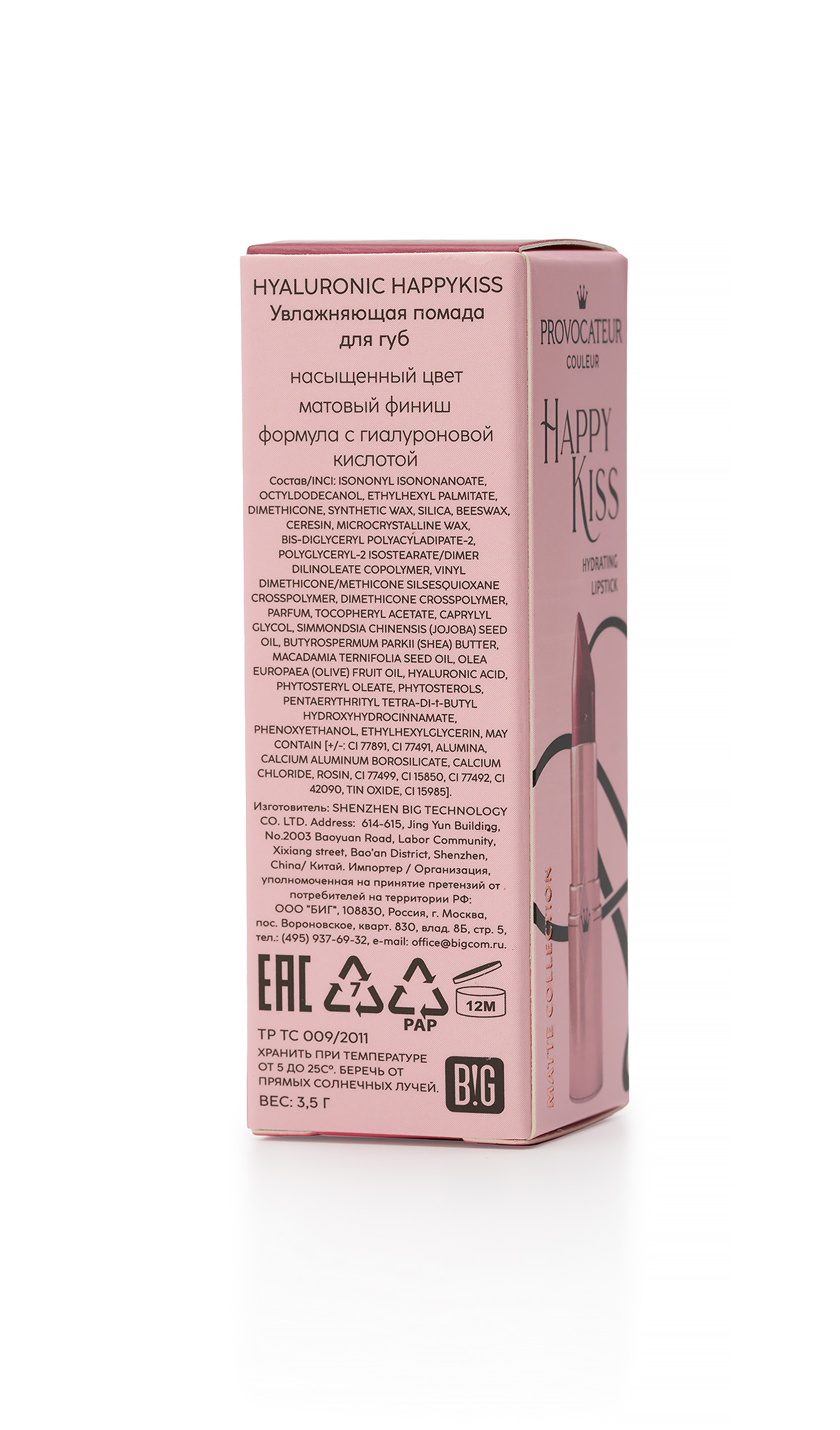 Увлажняющая помада Provocateur станет настоящим открытием для тех, кто ценит насыщенный, ровный цвет с первого нанесения и плотный финиш без блеска. Формула с гиалуроновой кислотой придаст губам увлажнение и здоровый вид. Матовая помада Happy Kiss - продолжение естественного цвета губ, неизменно привлекательного. Красивые, увлажненные губы с роскошным матовым оттенком добавят шарма вашему образу. Благодаря витамину Е и маслу оливы в составе, они будут выглядеть ухожено даже после долгого дня. Текстура помады невесомая, что обеспечивает комфортное ношение в течение дня - до 4 часов натурального, красивого цвета без сухости и шелушения. На губах она абсолютно незаметна, сохраняя при этом пигментированный цвет. Легкий аромат создает атмосферу роскоши и заботы. Помада прекрасно держит контур, даже без добавления лайнера-карандаша, не уступая по качеству и интенсивности цвета помадам Pupa, Artdeco, Max Factor, L’Oreal. Палитра оттенков разнообразна для любого тона кожи и возраста, чтобы каждая представительница прекрасного пола могла подобрать подходящий для себя цвет. Густые пигменты наполняют губы яркостью, скрывая мелкие недостатки кожи и делая улыбку более привлекательной. Эта увлажняющая помада стала находкой для тех, кто стремится сохранить красоту своих губ без лишних усилий. Создайте свой образ с новыми матовыми оттенками и ощутите всю легкость самовыражения! *Provocateur (французский язык, Провокатёр) Перевод на русский язык - Провокатор.