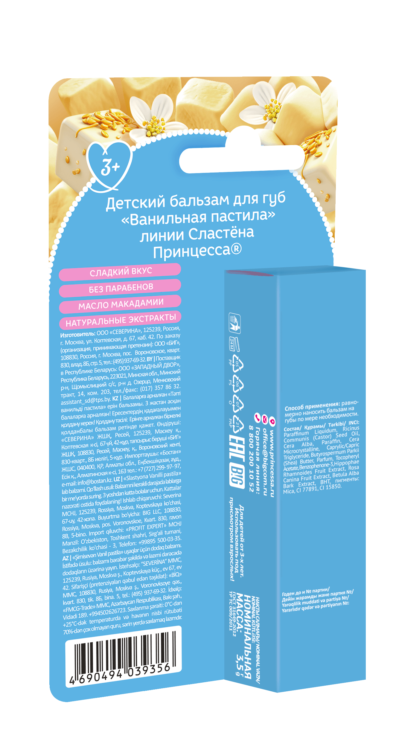 Комплекс из масла макадамии и натуральных экстрактов малины и шелковицы обеспечивает полноценный уход за нежной кожей губ, защищает и увлажняет ее. Бальзам Сластена не содержит парабенов, так как создан специально для маленьких красавиц. Теперь твои губки самые красивые и вкусные на свете!