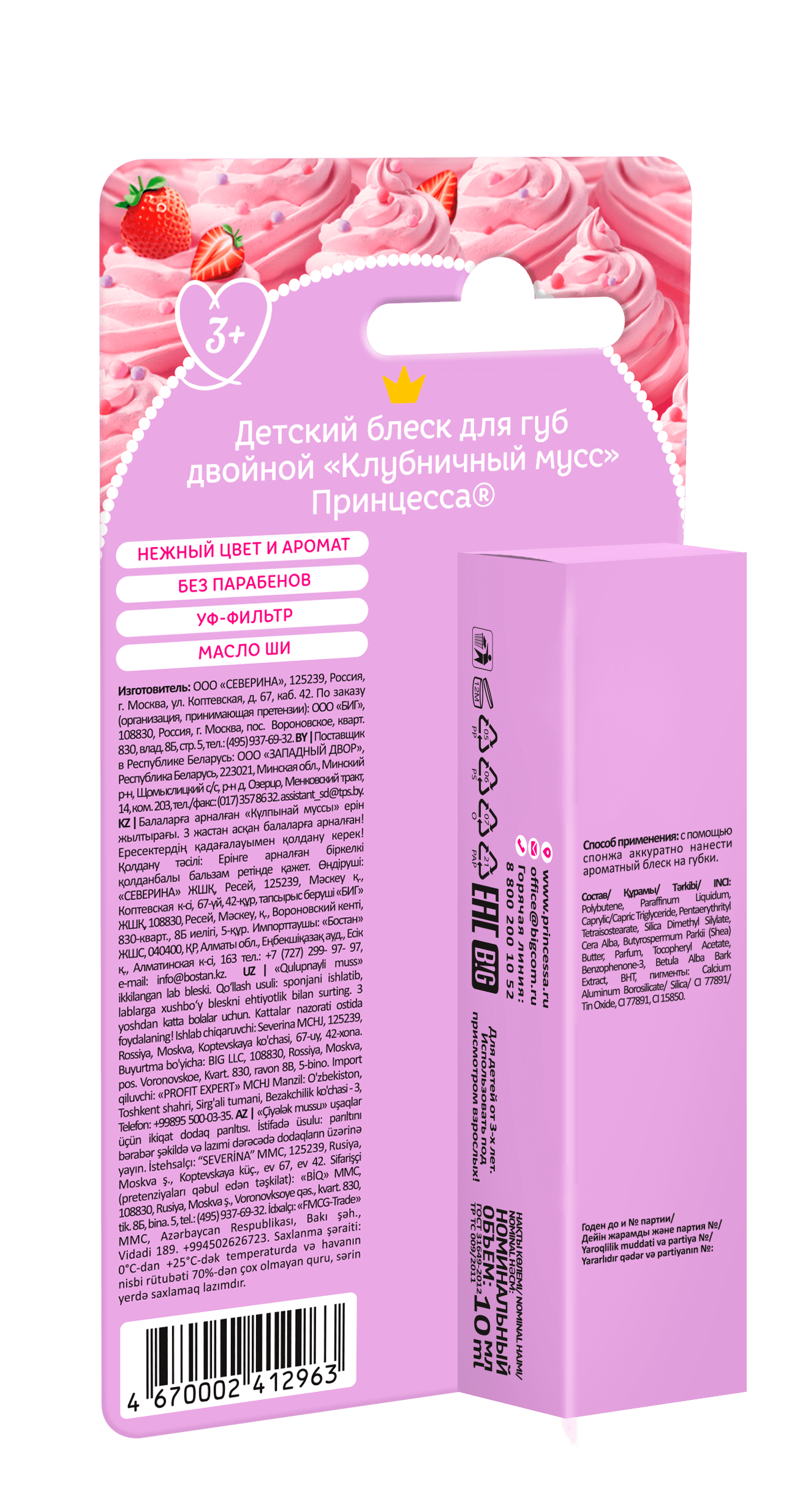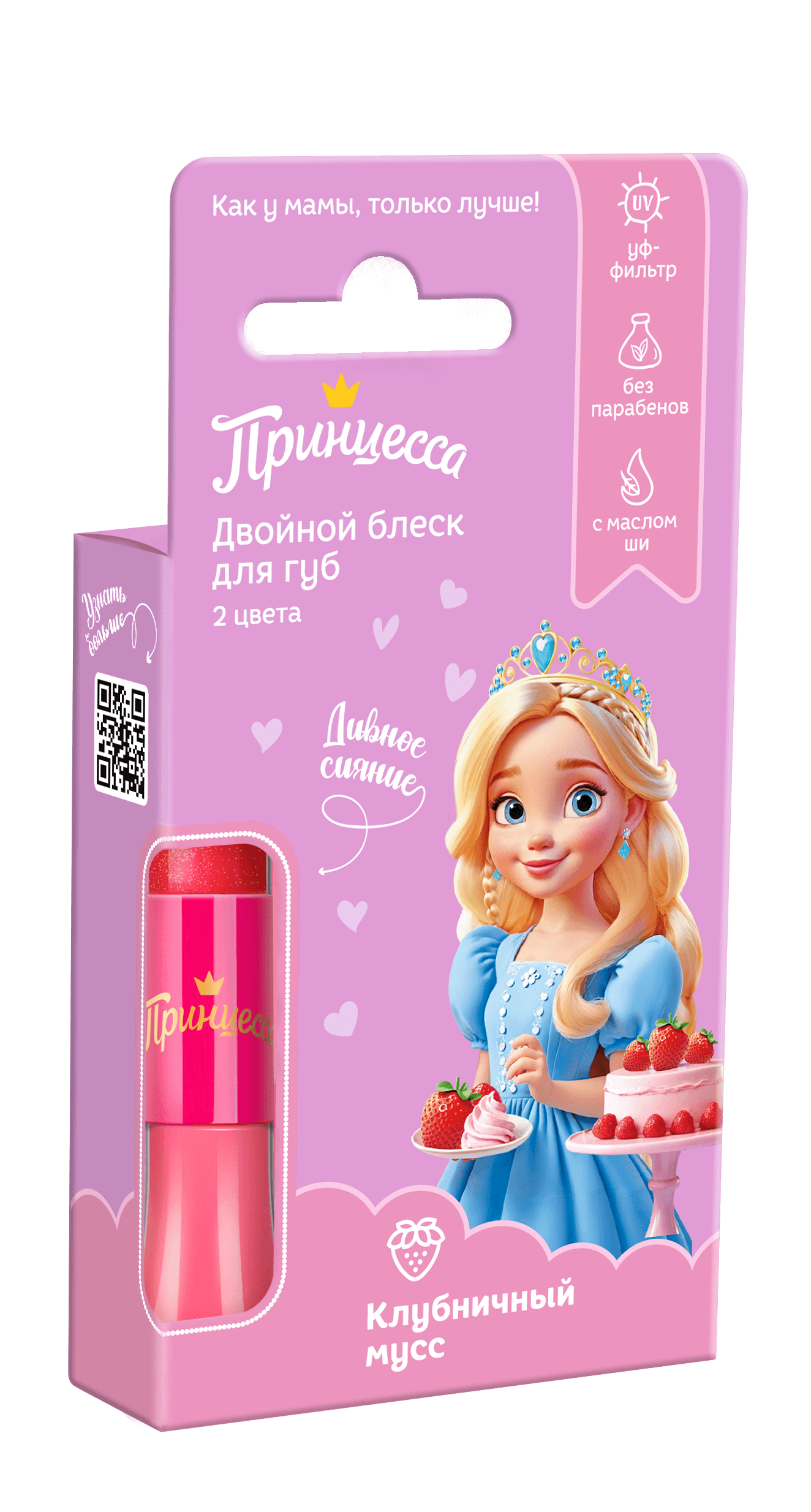 Нежная текстура, модные оттенки – как у мамы, только лучше! Необычный чудесный флакончик не оставит равнодушной ни одну модницу. Один флакон - два настроения! Нежный клубничный оттенок или яркое клубничное мерцание - выбирай сама!  Блеск создан специально для маленьких красавиц, поэтому не содержит парабены и обогащен комплексом  из масла макадамии и витамина Е, что обеспечивает полноценный уход за нежной кожей губ, защищает и увлажняет ее.