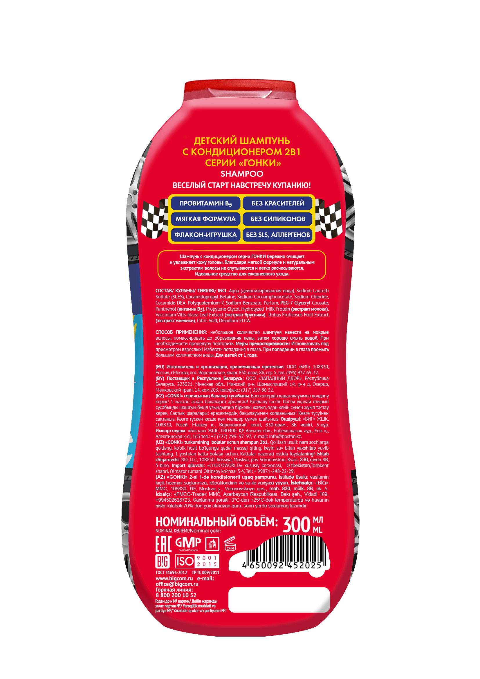 2 в 1, с кондиционеромСерия Гонки создана специально для озорных мальчишек, которые ни на минуту не хотят расставаться с любимой машинкой. Уникальный флакон в форме настоящего гоночного болида позволяет не прекращать игру даже в ванне, а мягкий состав и потрясающий аромат превратит любое купание в увлекательную игру! Веселый старт на встречу купанию!
