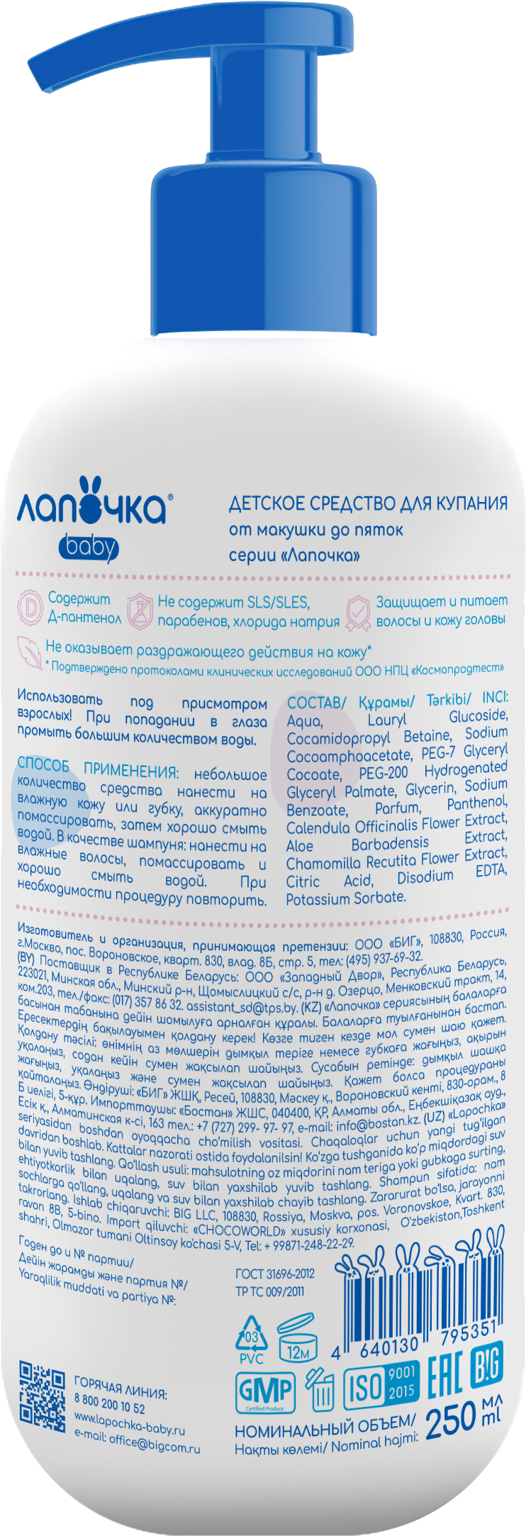 Детское средство для купания Лапочка предназначено для купания детей с рождения. Не раздражает глаза, не содержит мыла.