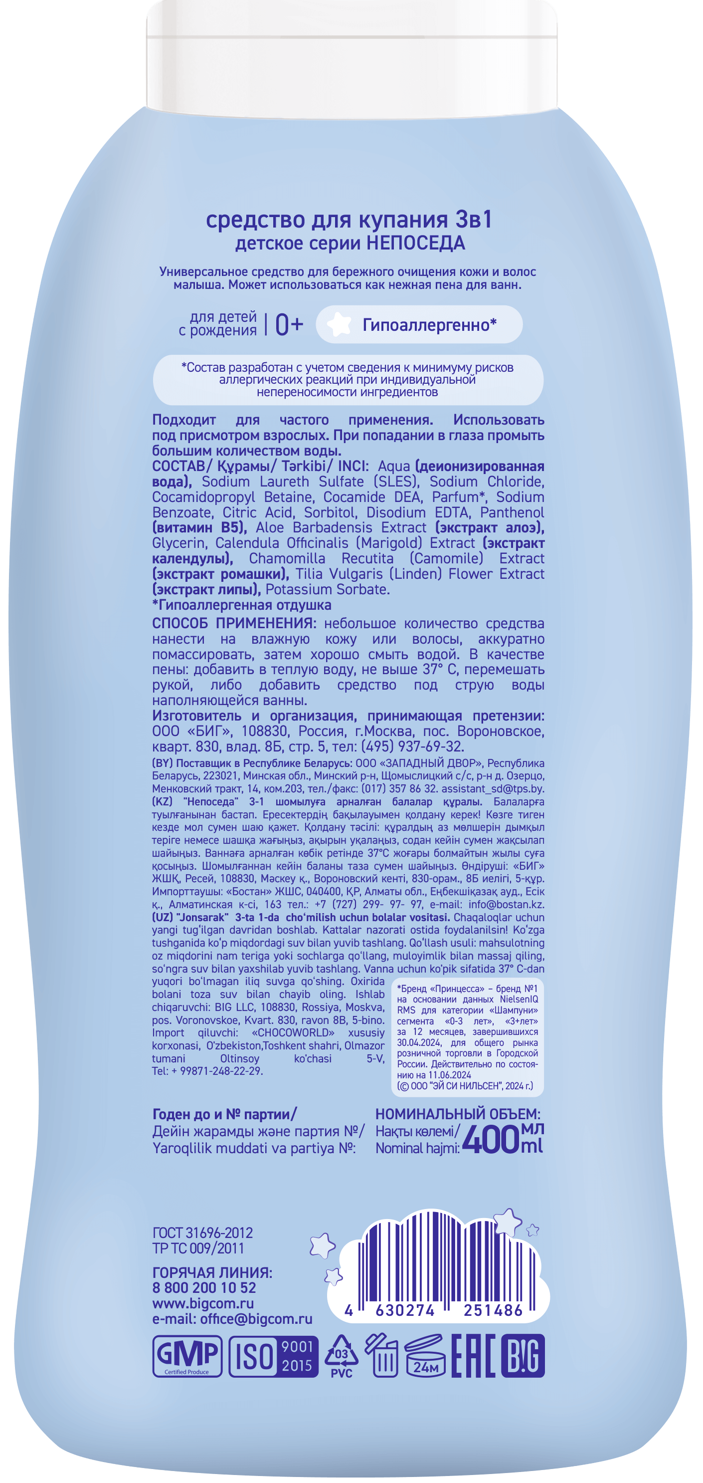Не содержит SLS, парабены, метилы, красители и аллергены. Бережное очищение от макушки до самых пяточек, а также нежная пена для принятия вечерней ванны - все в одном флаконе.