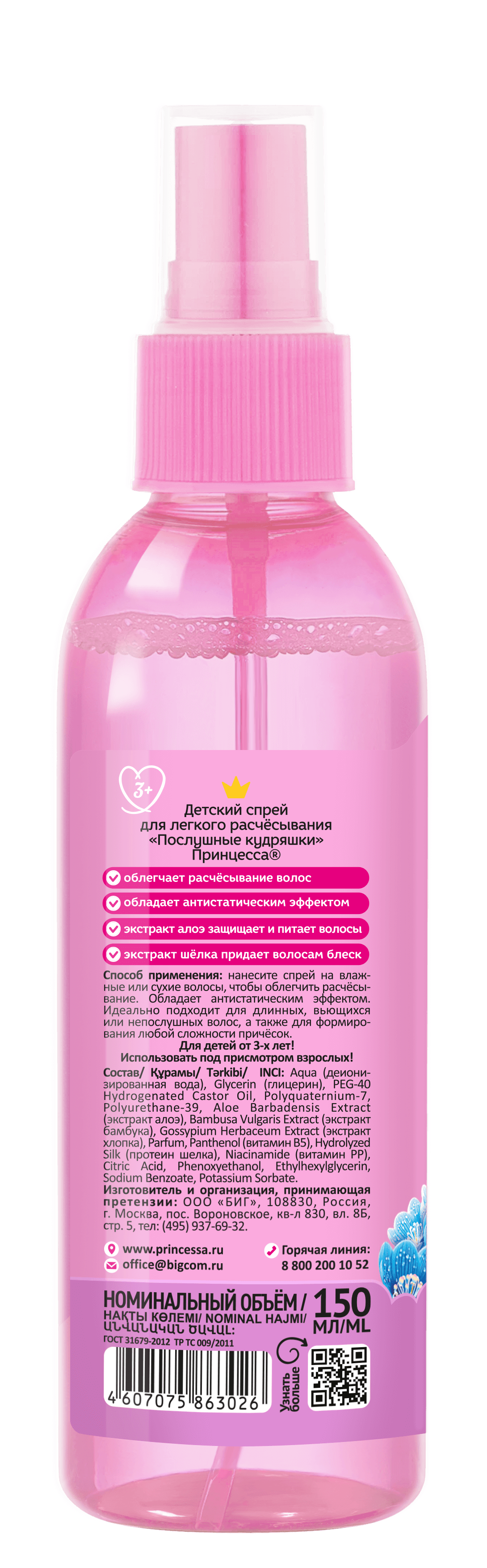 У Вашей малышки путаются волосы? Благодаря Спрею для волос «Послушные кудряшки» из специальной серии «Легкое расчесывание» уход за волосами станет настоящим удовольствием для маленькой Принцессы. Процесс расчесывания отныне становится легким, локоны послушными и блестящими. Легкий цветочный аромат придаст особую нежность образу маленькой красавицы. Спрей для волос – не смываемый продукт. Является прекрасным дополнением к шампуню и бальзаму для волос. Можно наносить на сухие и влажные волосы.