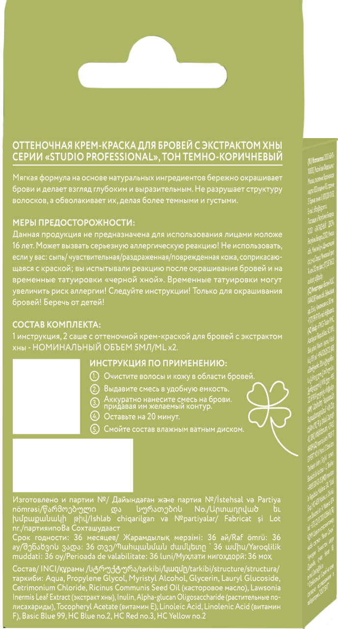 Крем-краска для бровей STUDIO PROFESSIONAL - профессиональное средство для максимально естественного окрашивания бровей и создания эффекта "пудрового напыления". Мягкая формула на основе натуральных ингредиентов бережно окрашивает брови и кожу зоны роста бровей. В состав крем-краски входят витамины E и F, органическое касторовое масло и биолин, которые питают и укрепляют волоски, делают их плотнее. Крем-краска готова к использованию и не требует смешивания с оксидантом. Насыщенная кремовая текстура легко наносится и не течет! Цвет сохраняется на коже до 5 дней и до 3-х недель на волосках.