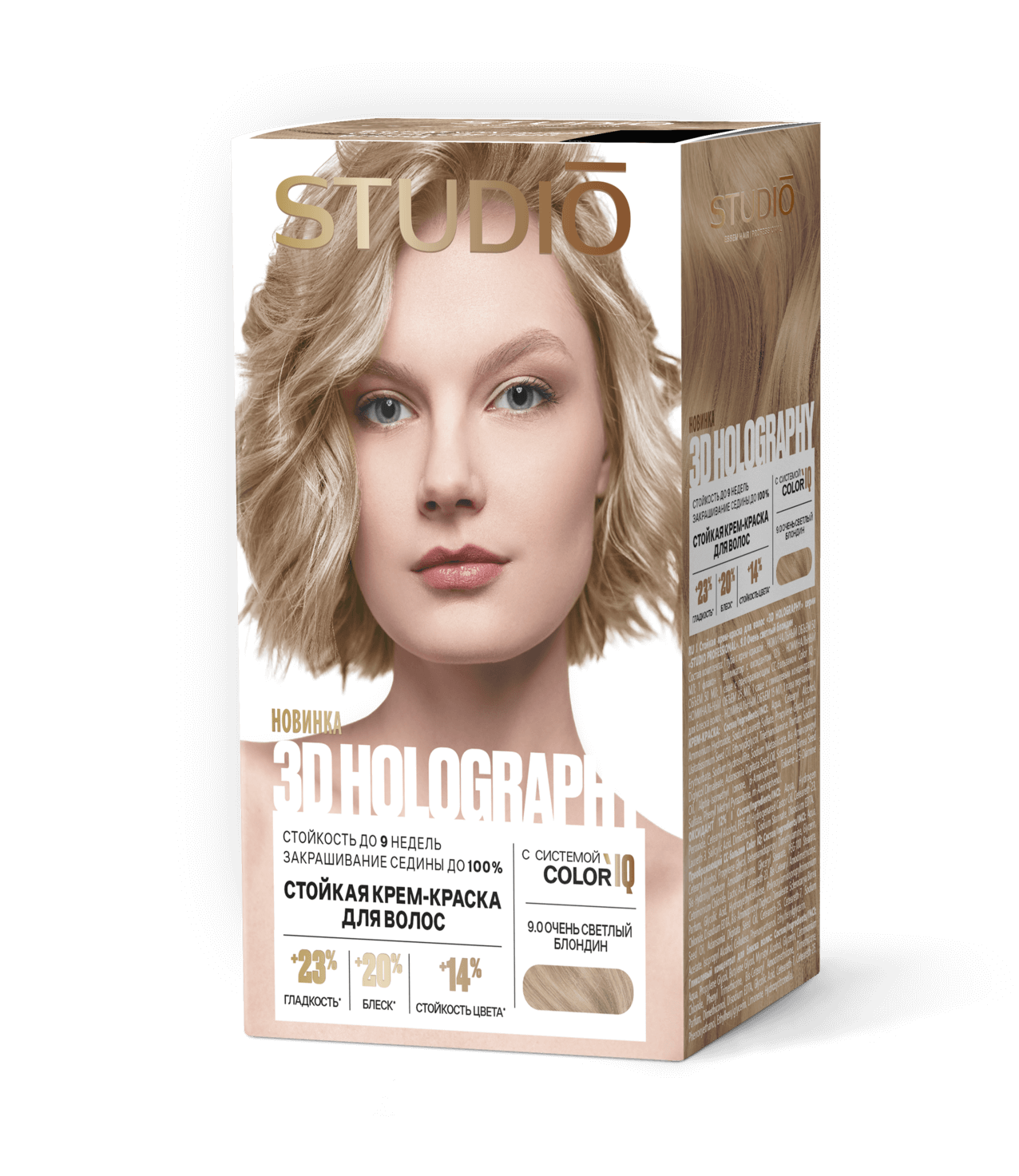 9.0 Очень светлый блондин3D HOLOGRAPHY – инновационная крем-краска с системой «умного цвета» Color IQ для стойкого и безопасного окрашивания.